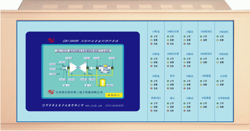 QBJ-3800B汽輪機安全監測保護系統是新一代新穎、精確、安全、可靠的TSI保護系統,它不僅適合于各種發電機組的監測和保護,也適合各種高速旋轉機械裝置的監測和保護。該產品采用了原裝進口高可靠性模塊和觸摸屏進行組合,對汽輪機的軸振動、軸瓦振動、軸向位移、脹差、偏心、油動機、油箱油位、熱膨脹、同步器、啟動閥、功率限制器、鍵相、零轉速、轉速、三取二超速保護等24路以內的各種信號進行實時監控和保護,通道內容可由用戶自由組合。可配用本廠生產的各種監測通道的相關傳感器,也可選配進口的相關傳感器。具有進口TSI儀表的功能,深受廣大用戶的歡迎。 如果測點超過24路,可選用擴展型框架,型號為QBJ-3800B/F型,最大可同時檢測40個測點,其功能不變。